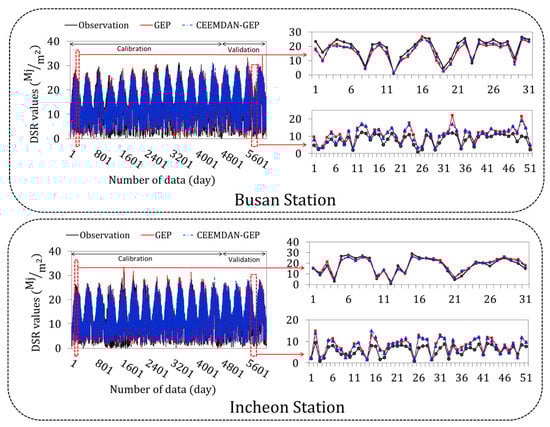 At Busan station, the forecasted values of DSR using the GEP model have RMSE = 2.992 (MJ/m2), RRMSE = 0.189, MAE = 2.402 (MJ/m2), NSE=0.814, WI = 0.955, and LMI = 0.585, while the CEEMDAN-GEP model produces the forecasted values with RMSE = 2.514 (MJ/m2), RRMSE = 0.171, MAE = 1.995 (MJ/m2), NSE = 0.873, WI = 0.974, and LMI = 0.654 in the validation phase.