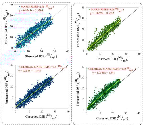 To confirm the accuracy of MARS and CEEMDAN-MARS models, scatterplots between observed and forecasted DSR at both stations are provided in Figure 6. Figure 6 illustrates that the forecasted DSR values using the CEEMDAN-MARS model were much closer to the corresponding observed DSR values than those of MARS model.