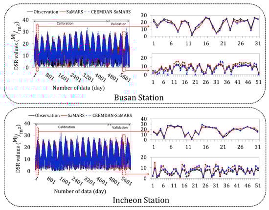At Incheon, comparison between SaMARS and CEEMDAN-SaMARS models suggested that the CEEMDAN-SaMARS model produces outstanding results (RMSE = 2.311 MJ/m2, RRMSE = 0.164, MAE = 1.931 MJ/m2, NSE = 0.883, WI = 0.967, and LMI = 0.659) compared with the SaMARS model (RMSE = 2.999 MJ/m2, RRMSE = 0.206, MAE = 2.455 MJ/m2, NSE = 0.769, WI = 0.948, and LMI = 0.537) for the validation phase at Incheon. Therefore, SaMARS model could not perform more efficiently than the CEEMDAN-SaMARS model for DSR forecasting at Incheon.