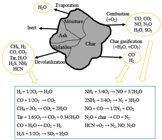 Gas-solid fluidized combustion is a process containing a series of complex chemical reactions. The main components of the fuel in the fluidized bed are fixed carbon, volatiles, moisture, and inert ash. After the fuel enters the furnace, the water evaporates rapidly, the fuel particles are heated and volatilized, and the remaining coke particles react with oxygen or water vapor to burn. Ash stays longer in the furnace than other components, so the calculation of ash can be handled separately. The combustible gases of different compositions generated during the coke combustion and volatilization analysis processes are burned in oxygen. The combustion process of powder coke is shown in Figure 1.