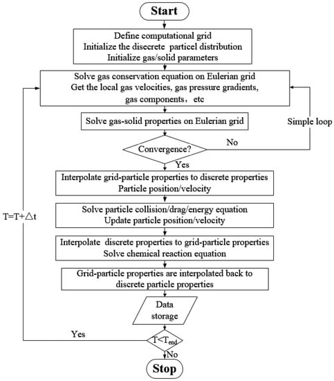 After the calculation starts, the data is first initialized. Initialization includes not only initialization of the gas-phase velocity field, pressure field, density field, and temperature field but also the calculation of particle discretization. The velocity and pressure distribution of the gas phase are calculated by the SIMPLE algorithm [25]. For the calculation of the solid phase, the force and motion are analyzed for every parcel separately. After the gas–solid flow calculation is completed, the information on the discrete particle phase is then averaged inside the grid. A series of heterogeneous chemical reactions, such as particle combustion and gasification, are calculated based on the averaging treatment, and the homogeneous reactions of the gas phase are also calculated. After the chemical reaction calculation is completed, the updated grid information is rediscretized into a discrete distribution of calculated particles, and then the next gas–solid flow calculation is completed.