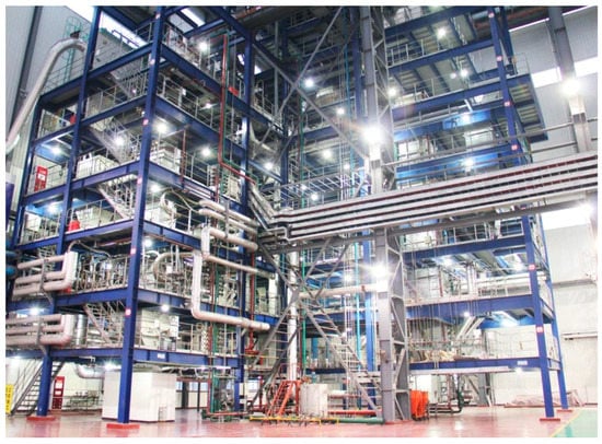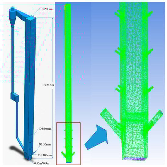 Figure 3 shows the Dongfang boiler’s experimental equipment. Figure 4 illustrates a schematic diagram of the experimental system, which contains a 24.5-m tall furnace, a cyclone, a recirculation bed, powder coke, and limestone feeding system. The main part of the fluidized bed system and the 3D grid of the furnace are shown in Figure 5. Detailed descriptions of the experiments can be found in Table 1. Table 2 is the elemental analysis of the powder coke used in the experiment. The particle size distribution of the powder coke is shown in Figure 6.