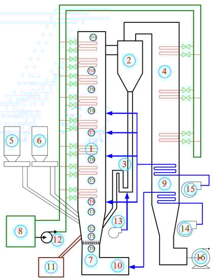 Schematic diagram of main equipment of the circulating fluidized bed (CFB) test bench. (1) Combustion chamber; (2) Cyclone separator; (3) Loop-seal recycle device; (4) Tail flue; (5) Fuel feeder; (6) Limestone feeder; (7) Fluidization air chamber; (8) Cooling water system (9) Air preheater; (10) Ignition unit; (11) Ash discharge system; (12) Feed pump; (13) High-pressure fluidized blower; (14) Primary fan; (15) Secondary air fan; (16) Draught fan.