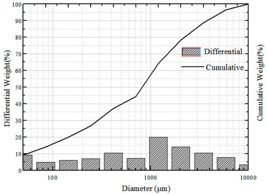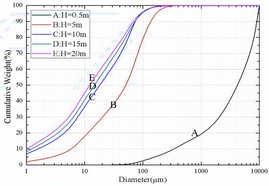 The curves A–E in Figure 10 are distributions of the particle size distributions of the solid particles at heights of 0.3, 5, 15 and 20 m, respectively, in the furnace. As the height of the furnace increased, the proportion of small-sized particles became larger and larger due to the influence of solid particle precipitation and backmixing, while the proportion of large-sized particles became smaller and smaller. After some of the particles entered the cyclone with the flue gas, the particles that had undergone cyclone separation were returned to the furnace through the return sealing device. Large-sized particles were mostly concentrated in the dense phase region at the bottom of the furnace.