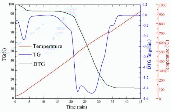 After the fuel particles were ground and subjected to thermogravimetric analysis on the US Perkin Elemer STA6000 instrument, the temperature–weightlessness–weight loss rate curve of the sample was obtained (Figure 7). The ignition point was determined by the thermal gravity-differential thermal gravity (TG-DTG) joint definition method. It can be seen from Figure 7 that with the increase in temperature, the TG curve below 120 °C had a rapidly declining trend, which was the rapid evaporation process of moisture. When the temperature exceeded 260 °C, the TG curve showed a second downward trend, which corresponded to the precipitation of volatiles, while some low-flammable volatiles began to ignite. The turning point of the TG curve was the ignition temperature, which was about 470 °C. As the temperature rose to 780 °C, the TG curve became a straight line, indicating that the fuel had burned out.