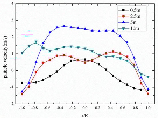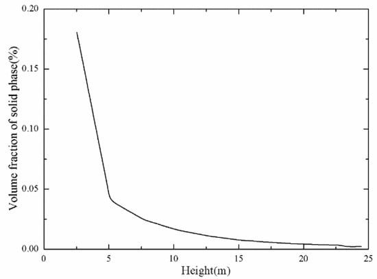 Figure 8, Figure 9 and Figure 10 show the main gas–solid parameters obtained by simulation. It can be seen from Figure 8 that there was a general tendency to move downward due to the injection of fuel particles and the backmixing of the large particle size from the return port at the bottom of the furnace. As the height increased, the fuel particles underwent a drying and crushing action, and the particle size gradually decreased. The movement of the particles in the 2.5-m dense phase region was complicated. When the height reached about 5 m, particles in the core area had an overall upward trend, but the particles near the wall moved downward along the water wall, showing a typical “core-annulus” shape. The particles in the core area flowed upward under the action of drag. Some of the particles continuously migrated to the vicinity of the wall. When the height exceeded 10 m, reaching the dilute phase region of the furnace, the backmixing between the core rings was gradually weakened, and the small particles in the dilute phase region tended to move upward. Figure 9 shows the distribution of the solid-phase volume fraction along the height. It can also be seen that the region below about 5 m was a dense phase region, and the solid-phase fraction was gradually reduced at 5 m or more.