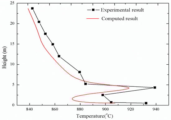 Figure 11 shows the comparison of temperature distribution under stable operating conditions between experiments and simulation. The temperature distributions obtained by simulation and experiment were quite close. After the coke was rapidly separated into volatiles after entering the furnace, the remaining coke was burned in the lower layer of the furnace to release a large amount of heat, resulting in the temperature of the lower layer of the furnace being relatively high. With the increase in furnace height, the oxygen concentration decreased with the consumption in the area below the secondary tuyere, and the temperature of the upper dense phase zone decreased with the addition of low-temperature fuel and limestone particles. At about 5 m, the fresh air brought from the secondary tuyere caused an increase of oxygen concentration, and the volatile combustion increased, forming a locally higher temperature. The temperature gradually decreased due to the cooling of the furnace wall above the secondary air vent.