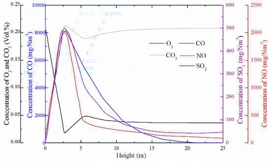As can be seen from Figure 12, the concentration of oxygen contained in the primary air at the inlet of the furnace gradually decreased after the gas–solid phase heterogeneous reaction occurred with the fuel particles in the dense phase region. The oxygen brought about by the secondary air caused a transient rise in the oxygen concentration near the secondary tuyere, and then the oxygen concentration gradually decreased as the gas-phase reaction proceeded. The changing trend of CO2 concentration was just opposite to that of O2, and it had been increasing after a short decline near the secondary air outlet. From the trend of CO concentration, it can be seen that in the dense phase region at the bottom of the furnace, the rate of CO formation was much larger than the consumption rate. Due to the insufficient oxygen concentration and the high concentration of combustibles in the dense phase region, the combustion was inadequate and a large amount of CO was generated. In the dilute upper phase of the furnace, the concentration of CO was gradually reduced, mainly because the consumption of combustibles was exhausted, and the remaining O2 in the flue gas reacted with CO to form CO2.