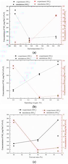 Three factors affecting pollutant emissions. (a) Effect of bed temperature on pollutant emissions; (b) Effect of operating oxygen on pollutant emissions; (c) Effect of first air ratio on pollutant emissions.