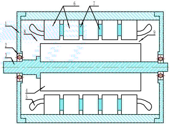 Schematic drawings of the generator with adjacent stator core. 1—end cover, 2—bearings, 3—shaft, 4—rotor, 5—stator windings, 6—adjacent stator core, 7—ventilation spacer, 8—left end of the generator, 9—right end of the generator.