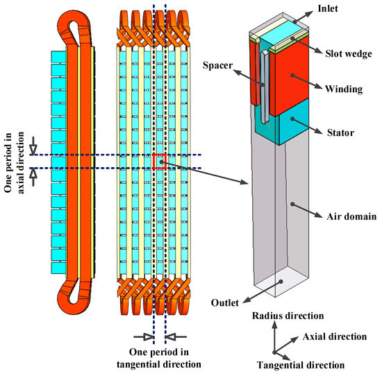 where lco is the winding dimension, lin is the insulation thickness, λco is the winding thermal conductivity, λin is the insulation thermal conductivity, and λe is the equivalent thermal conductivity. The copper coils’ thermal conductivity is 386.4 W/(m/K), and the thermal conductivity of the insulation materials is 0.29 W/(m/K).