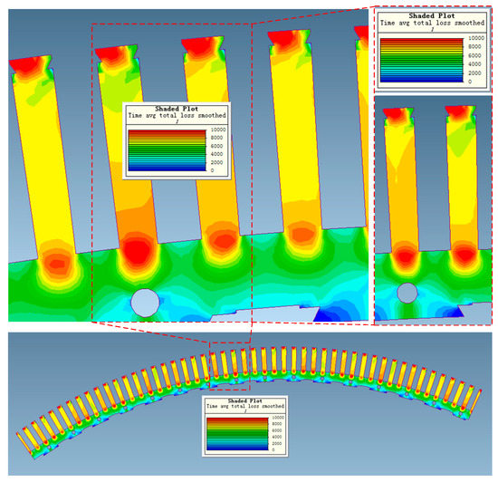To proceed the thermal and fluid flowing coupled calculations, the stator loss including the core loss and windings’ loss should first be determined. So, the 2-D electromagnetic field calculation model of Direct-Drive Permanent Magnet Wind Generators (DDPMWG) was established and solved by using the finite element method. The stator core loss distributions are obtained as shown in Figure 3. Due to the special design, the flux density at the teeth is 1.69 T (averaged), which is much larger than the yoke (1.26 T, averaged), so the core loss density of the teeth is much larger than that of yoke accordingly, as shown in Figure 3. For this generator, the total core loss of teeth is 14.42 kW, however the total core loss of yoke is only 8.36 kW. Since 63 different ventilation spacers schemes needed to be calculated to get the optimized ventilation spacer structure quickly and the calculation results differ with the actual generator, we took into account the core loss distributions, so we neglected the differences of the loss distributions in different parts of the stator core, and regarded the loss distributed in the core evenly to proceed the thermal and fluid flowing coupled calculations, then validated the optimized ventilation spacer by using the experiments. By this way, we could skip large simulation calculations and obtain the optimized ventilation spacer scheme faster. Table 3 shows the loss of each component of the generator.
