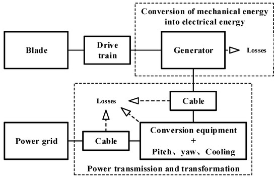 The simulation calculations for the 63 ventilation spacer schemes were carried out at the same loss, and the same air volume and inlet temperature. It is not appropriate to determine the preferred ventilation spacer structure only by the maximum temperature rise. Due to the fact the radial air passages with different ventilation spacer structures have different impedances, when the cooling air flows into the radial air passages corresponding to different ventilation spacer structures is kept constant, the resistance overcoming the cooling air flow is different—that is, when the temperature of the generator winding under a certain ventilation spacer structure is low, the air power required by the air-cooling fan may also be larger. Therefore, in order to evaluate the final preferred solution from the 63 ventilation spacer structures, it is necessary to comprehensively compare the generator winding temperature rise and the cooling air pressure drop. When the power of the generator is the same (the current is equal), the winding temperature directly affects the resistance of the winding and ultimately reflects in the copper loss. When the cooling air flow is the same, different pressure drops mean that the aerodynamic power of the fan is different. The pneumatic power provided by the cooling fan is the loss during the power conversion and transmission of the wind turbine (as shown in Figure 4), because the iron loss of the generator relative to the copper loss is small, and it is not very sensitive to temperature changes. Therefore, it can be considered that the iron loss is constant at different winding temperatures, and when the copper loss and the consumed pneumatic power are added together, the corresponding overall efficiency is lower, and vice versa. Therefore, under the premise of ensuring the same power, from the perspective of the efficiency of the whole machine, a certain relationship is established between the generator winding temperature and the cooling air pressure drop, to determine the preferred scheme of the ventilation spacer structure.