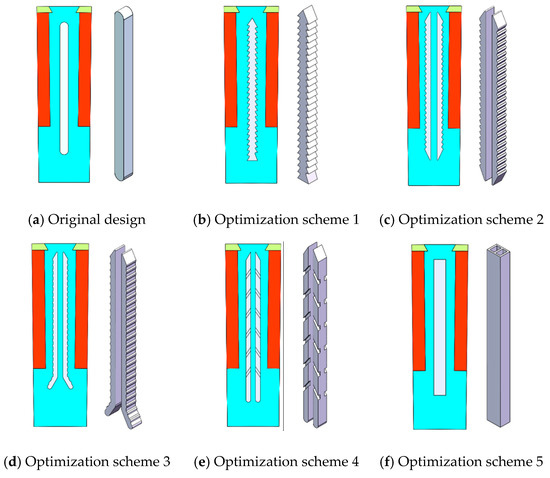 It can be seen from Figure 6 that the temperature field and the flow field contour maps corresponding to different optimization schemes have significant differences. As mentioned above, different ventilation spacer structures cause changes in the cooling air flow characteristics, which in turn affects the convective heat transfer between the cooling air and the stator conductor. Specifically, when the stator conductor loss and the cooling air volume are the same, the different ventilation spacer structures make the flow rate of the cooling air in the radial air passage different, and the turbulence of the cooling air when circulating the different structure ventilation spacers is also incomplete. The same occurs while the flow rate and turbulence directly affect the convective heat transfer coefficient between the cooling air and the winding. In addition, different ventilation spacer structures make the heat exchange area of the stator conductors different. Table 6 shows the convective heat transfer coefficient between the cooling air and the winding and the heat exchange area of the ventilation spacer in the different ventilation spacer structure scheme.