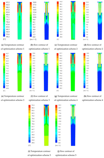The temperature field and flow field distributions obtained from numerical simulation calculation of the five ventilation spacer structure schemes are as shown in Figure 6.