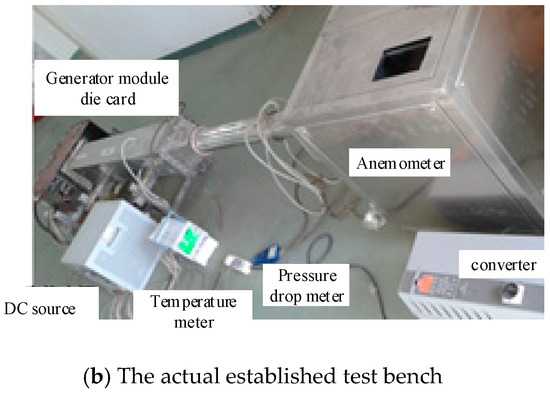 The test principles and built test bench is as shown in Figure 9. The actual heat transfer processing of the generator is described as follows: Firstly, a fan is used to evacuate the air in the stator yoke back area, so this area will be a negative pressure area as the fan operates, the cooling air will come into the generator module by through the wind tube, as shown in Figure 9a. A hole board is set in the wind tube to get the pressure drop, the pressure difference ΔP is determined by the orifice flowmeter located on both sides of the hole board, and the flow coefficient of the orifice plate and the wind speed is measured by using the anemometer. So, the air volume going into the generator can be calculated using the pressure drop, wind speed, and orifice flow coefficient. The micro-pressure gauge close to the test model is used to measure the outlet static pressure value. The pressure difference between the static pressure value and the atmosphere is the ventilation pressure drop of the model. The temperature of the windings is measured by a temperature measuring element embedded in the interior of the model. The actual cooling system test bench is built as shown in Figure 9b.