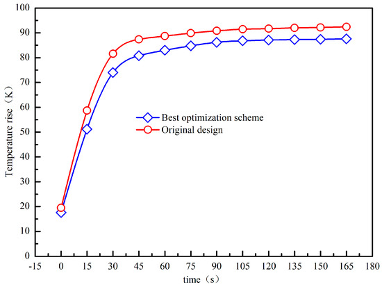 It can be observed from Figure 10 and Table 9 that the maximum temperature of the tested die card winding of the optimal ventilation duct structure is 4.7 K lower than the original design. However, considering that the ambient temperature of the two ventilation spacer schemes is slightly different, the maximum temperature of the tested mode card winding of the optimal ventilation duct is converted here, and the conversion is based on Equation (14):