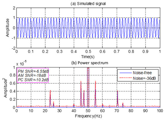 Figure 1a shows a small section of the signal with 409,600 samples, allowing for good averages when a 1024-point segment is used for fast Fourier transform (FFT), and a frequency resolution of 0.25 Hz is obtained when the sampling frequency is at 512 Hz. As seen in Figure 1a, the time-domain waveform is dominated by the sinusoidal carrier component of the supply fundamental frequency, very similar to a measured motor current signal. After converting it to the frequency domain, all the components induced can be clearly observed in the power spectrum in Figure 1b, which is magnified to show the small components of interest. The peaks of the sidebands are those at Hz, indicating the PM process; those at Hz for the AM process; and those at Hz for the PC process. However, due to the additive noise, the higher order harmonics of the PM process cannot be resolved in the power spectrum and the magnitudes corresponding to different frequencies are higher than that of the noise-free power spectrum. Because of this magnitude difference, it is understandable that a method based on power spectrum will give rise to uncertainties in quantifying the fault severity.
