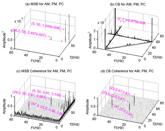 Figure 2 shows MSB and CB results and their corresponding coherences for the simulated signal, which are obtained by using the same weighting windows, size and averages as that of the power spectrum shown in Figure 1 in performing FFT. The MSB magnitude in Figure 2a shows five visible peaks at bifrequencies: (0, 50) Hz, (5, 50) Hz, (10, 50) Hz, (15, 50) Hz and (24.2, 50) Hz. Although some of these peaks are tiny, they can be made more visible in the corresponding bifrequencies of the MSB coherence in Figure 2c, showing that the MSB coherence is good at differentiating small components because of normalisation. Similarly, the PC component cannot be seen in the MSB because of its very low magnitude at its possible carrier of Hz. However, there is a distinctive peak at the bifrequency (47.3, 23.5) Hz in the MSB coherence, which is clearly related to the PC component. It means that Hz is the equivalent carrier, Hz is the lower sideband and 70.5 Hz is the upper sideband. Regarding the phase connection of the MSB at this bifrequency, it can be calculated according to Equation (14) as rad, which is very close to the phase value of 0.99 shown in Figure 2c.