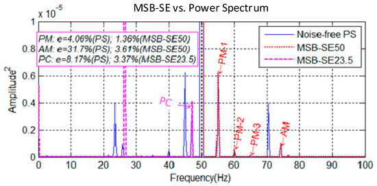 It can be seen in Figure 3 that all the peaks due to PM and AM can be determined by MSB-SE50, but only the second peak of the PC can be determined by MSB-SE23.5. Nevertheless, these identified peaks show very close magnitudes to that of the noise-free power spectrum, showing that the MSB has excellent performance in suppressing noise for obtaining accurate magnitude estimation. By comparing the magnitude estimation error through a Monte Carlo method, it is shown that the MSB produces a very accurate estimation of the sidebands. In particular, the sideband of the power spectrum produces an error as high as 31.7% for the AM, which has an SNR as low as −18 dB. This error will lead to unsatisfactory results for fault diagnosis. Conversely, the MSB has only a 3.61% error and thus will produce more reliable results.