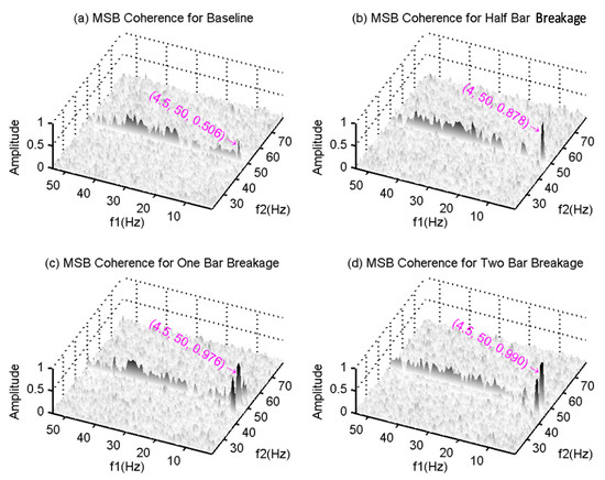 The quality of the MSB peaks can be further assessed by their corresponding coherences. As shown in Figure 5, the baseline coherence value at the characteristic bifrequency is only 0.506. As discussed in Section 3, this small amplitude indicates that the accuracy for MSB magnitude estimation is low. On the other hand, the values are 0.878, 0.976 and 0.9903 for the half-, one- and two-BRB cases, respectively, showing that the MSB amplitude estimators have a very high degree of accuracy and thus confirm the reliability of BRB detection and diagnosis.