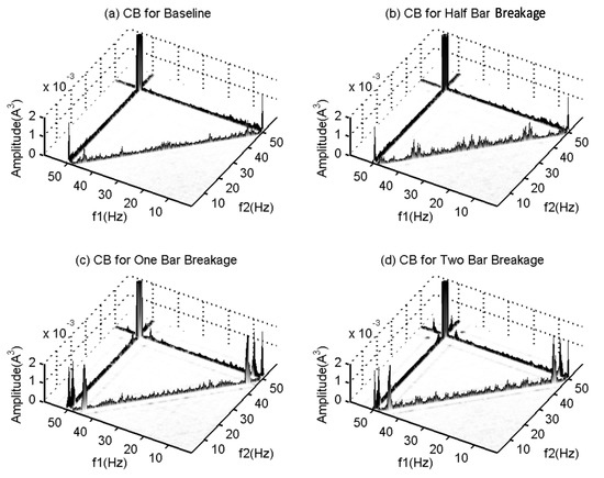 Interestingly, Figure 7a,b,d shows a peak at (50, 50) Hz. This indicates that certain coupling exists between the 50 Hz and 100 Hz components in these three cases, which may be due to random asymmetric supplies when the tests were performed. However, because the values are around 0.5, they probably cannot be reliable for detecting the supply asymmetry with high confidence. A further study needs to be performed to confirm this finding, which is beyond the focus of this paper. Nevertheless, Figure 7c does not show these peaks at all, further confirming that this peak is not a reliable feature for BRB detection. Instead, it also shows that the CB analysis is not reliable for motor current analysis because several sets of data signals are needed for re-examining any possible peaks to avoid any erroneous results.