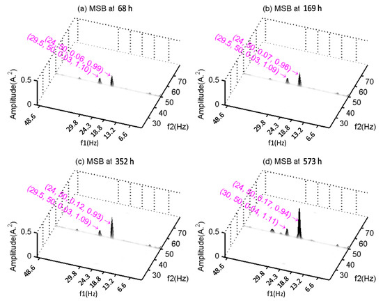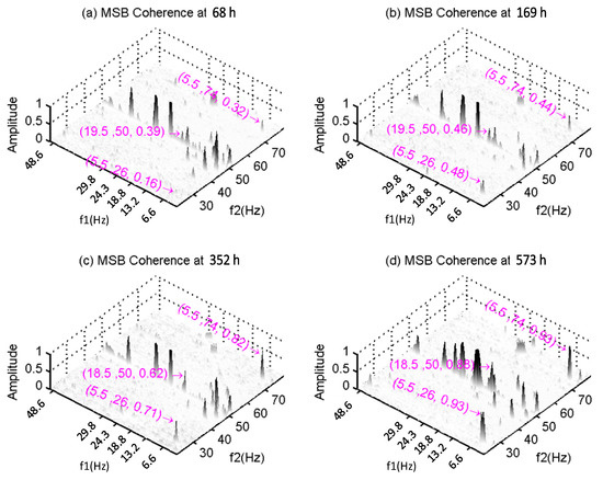 Another set of peaks found in the coherence of Figure 9 are those at bifrequencies (5.5, 26.0), (5.5, 74.5) Hz and (18.5, 50) Hz. They start with a very small value of 0.244 at the beginning and increase to 0.919 in the end, showing a close correlation with the deterioration process presented by the MSB peak at (24.5, 50) Hz. Based on the vibration characteristics, it can be seen that the peaks at 5.5 Hz () and 74.5 Hz () are from the shaft mutual modulation due to the change of rotating speeds. Therefore, these peaks can also be evidence of the deterioration of the gearbox at the first stage. More importantly, it explains that Z2 also undergoes a fast wear rate process similar to Z1. However, this peak results from a modulation with a much smaller carrier and hence cannot be observed in the MSB peaks.