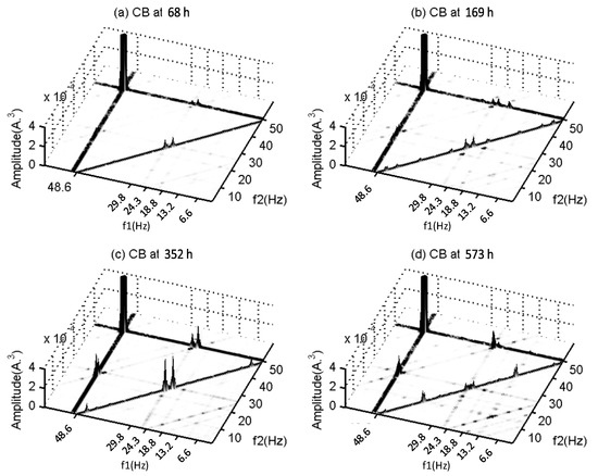 Figure 10 and Figure 11 show the results of CB for the gearbox data sets. Although there are multiple frequency components which potentially have PCs, the results still show similar characteristics to that of the CB from motor BRB. There are no clear peaks found in the CB that relate to the shaft frequencies of interest or give any indication of a consistent change with operating time. Some of the peaks, such as that at (13.2, 13.2) Hz, may show a marginal relation, but the CB coherences show corresponding peaks.