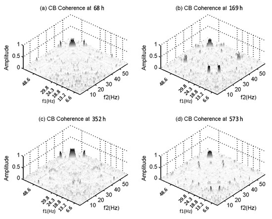 In addition, many other peaks can be observed in the coherence, showing the complicated nonlinear process of gearbox transmission. Moreover, the peaks at the bifrequency (6.6, 50) Hz and other relative bifrequencies, such as (6.6 × 1, 50 − 6.6) Hz and (6.6 × 2, 50 − 6.6) Hz, which relate to of the output shaft, can also be observed more clearly in the coherence. However, these peaks show little change during the testing period, indicating that the deterioration of the gears in the second stage is negligible. This agrees with the fact that these gears have no faults seeded and the lubrication condition will be maintained with the large diameter of Z4 when the oil level is lower.