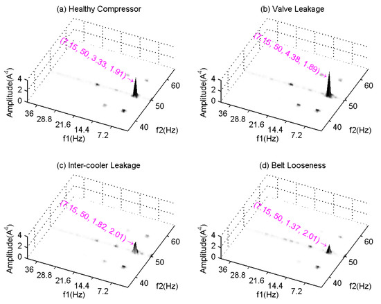 Figure 12 shows the MSB results for the healthy compressor and the three faulty cases. The healthy case exhibits a major peak at the bifrequency (7.15, 50), which relates to the compressor working frequency. In addition, the MSB peaks at bifrequencies (7.15 × 1, 50 − 7.15) Hz, (7.15 × 3, 50) Hz and (7.15 × 2, 50 − 7.15) Hz also clearly show up in the figure. These peaks indicate that higher order harmonics of the compressor working frequency also produce nonlinear interactions and may be relied on for differentiating between the faulty cases.