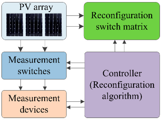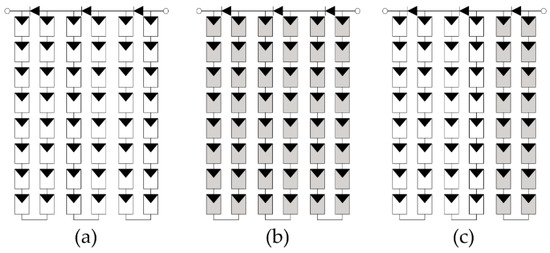 With the growing demand for electrical energy and environment protection, photovoltaic (PV) systems have drawn more and more attention since they can provide renewable and clean energy [1,2]. In its application, a PV array may be partially shaded due to clouds, buildings, trees, and bird litters, etc. [3,4,5]. Under partial shade conditions, current mismatch and voltage mismatch can dramatically reduce the power generation of a PV array [6,7,8]. In particular, if shading occurs at midday, when solar irradiation is high, the shadow effect would be significant [9]. Apart from shade area, the power loss of a PV array under partial shade conditions is also related to the shade pattern and array configuration [10]. Meanwhile, the power-voltage (P-V) curve of a PV array exhibits multiple peaks, only one of which is a global maximum power point (GMPP). This increases the difficulty in maximum power point tracking (MPPT) [11]. To track the GMPP, multiple techniques have been used for MPPT, such as an artificial neural network [12], fuzzy logic control [13], the generalized pattern search method [14], and the improved pattern search method [15]. It should be noted that even when GMPP is tracked, part of the modules may not output power since the shaded modules may be short-circuited by the bypass diode [16]. As a result, the extracted power of a PV array will be lower than it can deliver [17]. Additionally, a mismatch problem can also lead to a hot-spot effect, which accelerates the degeneration of PV panels and increases the discrepancy of cell parameters. As a result, the mismatch problem is aggravated [18].