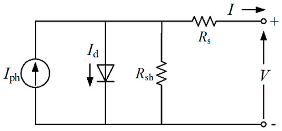 The output characteristics of a partially shaded PV array can be modeled based on the equivalent circuit of a PV cell, such as a one diode model or a two diode model. In this paper, a one diode model is adopted since the accuracy is enough and the expression is simple [29,30,31]. The equivalent circuit of a one diode model is shown in Figure 2.