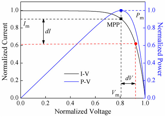 It can be found that the P-V curve exhibits one power peak at the MPP voltage, . The corresponding current is MPP current, . When all of the PV panels operate at their MPP, the absolute maximum power of the PV array is: