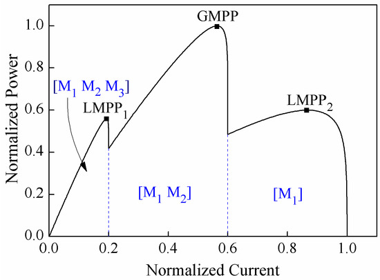 The reason for using EMPPs to execute the reconfiguration is explained as follows. On the one hand, reconfiguration is executed on the level of the module if the EMPP is used for reconfiguration. As shown in Figure 4, different MPPs correspond to different numbers of effective modules. Here, the effective module is the module that is not short-circuited by a bypass diode. For example, if a PV string operates at GMPP in Figure 4, M3 is bypassed and cannot output power since its short-circuit current is smaller than the string current. Therefore, M1 and M2 are effective modules. Similarly, if a PV string operates at LMPP1 and LMPP2, effective modules are M1, M2, M3 and M1 respectively.