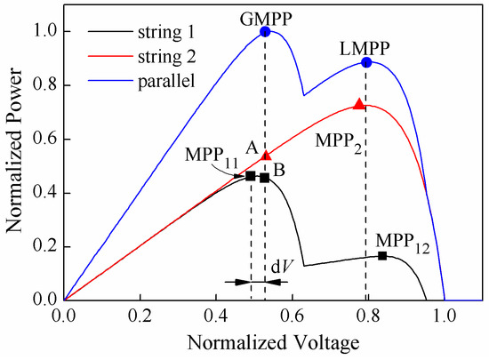 where is the current of a PV string, and is the voltage of the PV array. Under non-uniform irradiance conditions, is different from , . The notation represents the MPP voltage of a PV string, where the superscript denotes the number of effective modules in the string and the subscript j represents the j-th string. If is satisfied, the relationship between and can be sorted into two categories, which is illustrated by P-V curves of a PV array and its two strings, as shown in Figure 5. PV string 1 is partially shaded. Specifically, it receives an irradiation profile consisting of two irradiance levels. Thus, the P-V curve of string 1 exhibits two MPPs: MPP11 and MPP12 in Figure 5. On the contrary, PV string 2 is uniformly illuminated and therefore the P-V curve of string 2 exhibits only one MPP: MPP2 in Figure 5.