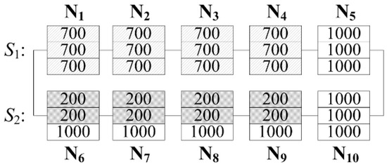 A PV array composed of two strings with an irradiance pattern, as shown in Figure 8, is considered in this case. The first four panels in the first string, S1, receive uniform irradiance of 700 , while the first four panels in the second string receive non-uniform irradiance of 200 and 1000 . The temperature of the PV modules subjected to 200, 700 and 1000 is assumed to be 20, 35 and 44 , respectively. The ten panels are labeled as N1 to N10. Note that Section 3 provides a detailed explanation of the reconfiguration steps, explicating the algorithm.