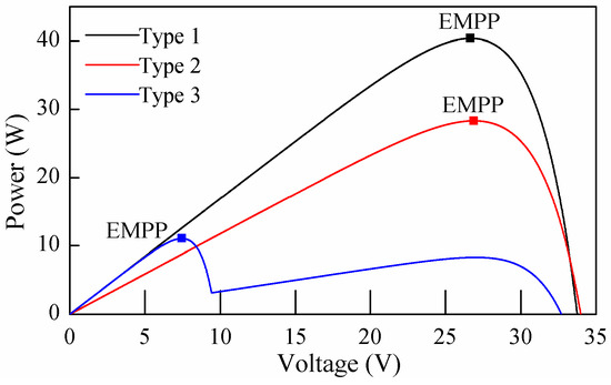 The first step was to determine the EMPPs of all of the panels. As shown in Figure 8, there are three types of irradiance patterns for PV panels: Uniform irradiance of 1000 (Type 1), uniform irradiance of 700 (Type 2) and non-uniform irradiance with both 200 and 1000 (Type 3). P-V curves of three types of PV panels are shown in Figure 9. For Type 1 and 2, there is only one MPP on the P-V curve. Therefore, this MPP is the EMPP. For Type 3, the P-V curve exhibits two MPPs. According to the definition of EMPP, GMPP is the only EMPP since the current of LMPP is smaller than that of GMPP. The EMPP voltage and current of Type 1, 2, 3 are 3, 3, 1 and 1.52, 1.48, 1.05, respectively. Thus, the EMPP current and voltage vector can be acquired as: = [1.52 1.52 1.48 1.48 1.48 1.48 1.05 1.05 1.05 1.05], = [3 3 1 1 1 1 3 3 3 3].