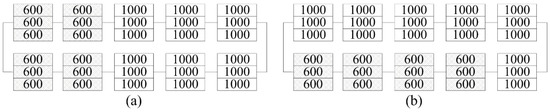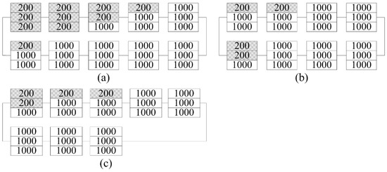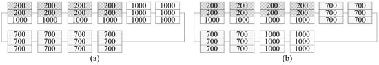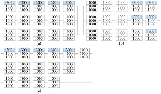 A PV array with three strings was considered in case 4. The irradiance pattern is shown in Figure 17a. The temperature of the PV module subjected to 300 was assumed to be 23 . The PV array reconfigured by the proposed method and the reference method are shown in Figure 17a,b. The P-V curves of the PV array before and after reconfiguration are compared in Figure 18. According to the P-V curves, CEMPP and Copt increases the power output from 467.8 W to 524.9 W and 508.7 W, respectively, corresponding to the reconfiguration efficiency of 12.21% and 8.74%, respectively.