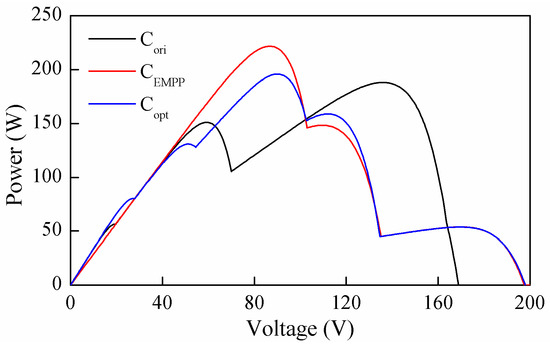The final configurations of CEMPP and Copt are shown in Figure 11; the corresponding P-V curves are compared in Figure 12. The global power point corresponding to Cori, CEMPP and Copt is observed at 188.3 W, 221.6 W and 195.8 W, respectively. The reconfiguration efficiency of CEMPP and Copt is 17.68% and 3.98%, respectively. The improvement of CEMPP compared with Copt is attributed to a much smaller current mismatch in CEMPP. For Type 3, GMPP was the only EMPP, which meant only the module subjected to 1000 W/m2 was an effective module. For Type 1 and 2, all of the modules were effective. In CEMPP and Copt, the number of effective modules in S1 and S2 was the same, i.e., 10 and 12. However, the current mismatch of CEMPP and Copt were different. Since the reconfiguration using the proposed method was on the level of the PV module, the effective modules with the same irradiance were connected to the same string. This minimized the current mismatch. On the contrary, effective modules with different irradiances were connected in the same string using the method in Reference [17], causing significant current mismatch of modules with irradiance of 1000 W/m2.