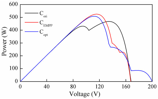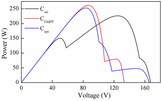 For this case, the primary and optimized configurations are shown in Figure 15. The P-V curve of the PV array with a different configuration is shown in Figure 16. The global power point corresponding to Cori, CEMPP and Copt is observed at 226.5 W, 261.9 W and 253.0 W, respectively. Therefore, the reconfiguration efficiency of CEMPP and Copt are 15.6% and 11.7%, respectively. Also in this case, the proposed method had a better performance compared with the reference method. The improvement can be illustrated based on the difference between CEMPP and Copt, shown in Figure 15b,c, respectively. In both configurations, two PV panels subjected to uniform irradiance of 200 W/m2 were disconnected from the PV array. In the eight remaining panels, the module with an irradiance of 1000 W/m2 was the effective module. In CEMPP, 20 effective modules were evenly allocated in two strings, i.e., 10 effective modules per string. On the contrary, the number of effective modules for Copt in two strings was 11 and 9, leading to higher voltage mismatch and therefore lower power output.