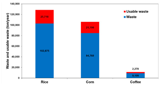 Waste from rice, corn, and coffee plantation. Based on data from [14]. Adapted with permission from the publisher.