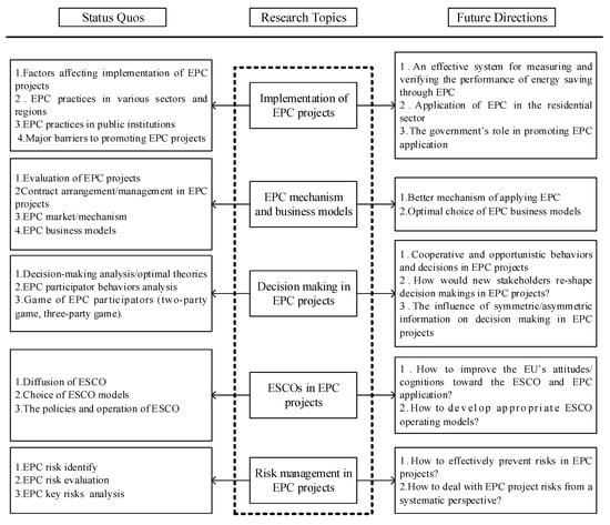 - Based on the analysis of the five EPC research topics, the future research directions/trends are proposed and discussed. The trends of EPC research in future cover five directions and twelve subtopics in total. Firstly, three research trends exist on the topic of “implementation of EPC projects”, including ‘An effective system for measuring and verifying the performance of energy saving through EPC’, ‘Application of EPC in the residential sector’, and ‘The government’s role in promoting EPC application’. Secondly, two directions of “EPC mechanism and business models”, covering ‘Better mechanism of applying EPC’ and ‘Optimal choice of EPC business models’. Thirdly, trends of “decision-making in EPC projects” are ‘Cooperative and opportunistic behaviors and decisions in EPC projects’, ‘How would new stakeholders reshape decision-makings in EPC projects’ and ‘The influence of symmetric/asymmetric information on decision-making in EPC projects’. Fourthly, there are two directions of “ESCOs in EPC projects”, including ‘How to improve the EU’s attitudes/cognitions toward the ESCO and EPC application’ and ‘How to develop appropriate ESCO operating models’. Finally, two directions in topic of “risk management in EPC projects” are ‘How to effectively prevent risks in EPC projects’ and ‘How to deal with EPC project risks from a systematic perspective’.