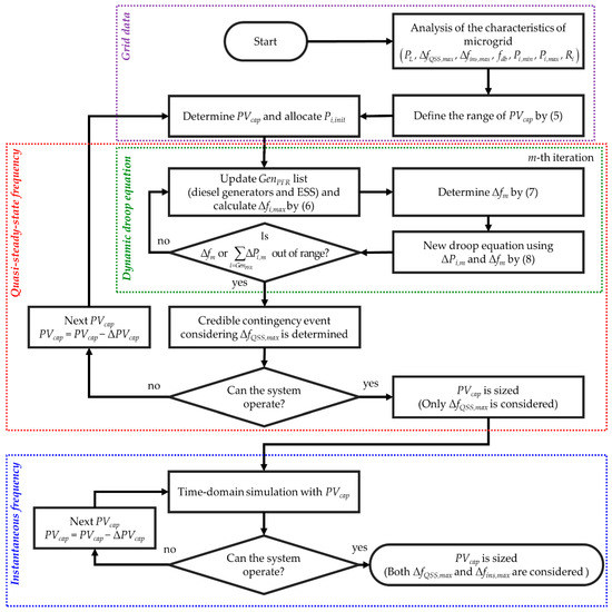 Firstly, the desired numbers of operating diesel generators and ESSs are set, as well as the load demand. Then, the required frequency limits, the maximum QSS (ΔfQSS,max) and instantaneous (Δfins,max) frequency deviation limits, and frequency deadband (fdb) are specified. In addition, data for the minimum (Pi,min) and maximum (Pi,max) power output and the droop coefficient (Ri) of i-th generator are required. Once the number of operating diesel generators and the load demand, PL, are determined, the capacity range of PV can be specified as follows: