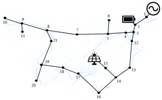 The practical stand-alone microgrid system of “D” island in South Korea was considered to evaluate the maximum penetration capacity of PV, as shown in Figure 4. In this microgrid, diesel generators produce most of the power. However, a large amount of PV and ESS units were installed for their replacement. The locations of loads, diesel generators, PV, and ESS units were determined by the Korea Electric Power Corporation (KEPCO) in South Korea. The parameters and load demands utilized in this paper for the microgrid system are shown in Table 1 and Table 2. In addition, each diesel generator used in this microgrid is described in the upcoming sections.