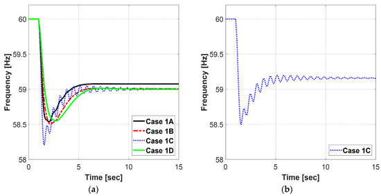 Frequency responses without energy storage system (ESS): (a) after credible contingency based on the quasi-steady-state (QSS) frequency (Cases 1A–1D); (b) after credible contingency based on the instantaneous frequency (Case 1C).