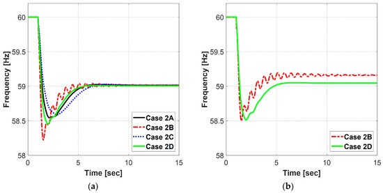Frequency responses with ESS: (a) after credible contingency based on the QSS frequency (Cases 2A–2D); (b) after credible contingency based on the instantaneous frequency (Case 2B and 2D).