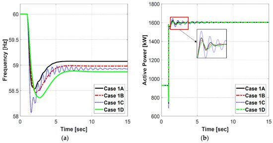 The time-domain simulations were performed to verify the evaluated maximum capacity of PV without ESS for each case, as shown in Figure 6. At 1 s, the power generated by the installed PV decreased from its maximum to zero. The QSS frequency for Case 1A was 59.08 Hz, while the frequency deviation calculated by the dynamic droop equation was 59.07 Hz for the contingency of 680 kW as shown in Figure 6a. For Cases 1B–1D, the system frequency decreased from its nominal value of 60 Hz to 59 Hz. Thus, it can be concluded that the QSS frequency was stable for all four cases. However, the minimum instantaneous frequency in Case 1C was 58.2 Hz, deviating beyond the required limit of 58.5 Hz. Therefore, the capacity of PV should be reduced at the last step of proposed algorithm. In Case 1C, the capacity of PV decreased from 633 kW to 533 kW considering the instantaneous frequency limit as shown in Figure 6b. Thus, the stability of both QSS and instantaneous frequency was satisfied.