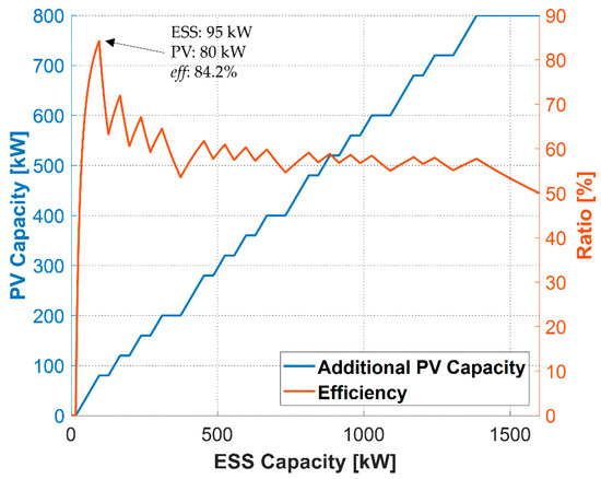 where the ESScap is the installed capacity of the ESS, PVcap,add is the additional capacity of PV when the ESS is installed with the value of ESScap, and eff is the efficiency of ESS for the value of PVcap,add. When the ESS is installed with 95 kW, the additional permissible capacity of PV will be 80 kW, with a maximum efficiency of 84.2%. In addition, the ESS can be optimally sized based on the capacity of planned PV for “D” island. Although the results are specified for the “D” island, the efficiency decreases as the capacity of ESS increases after the optimal point.