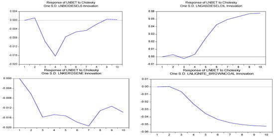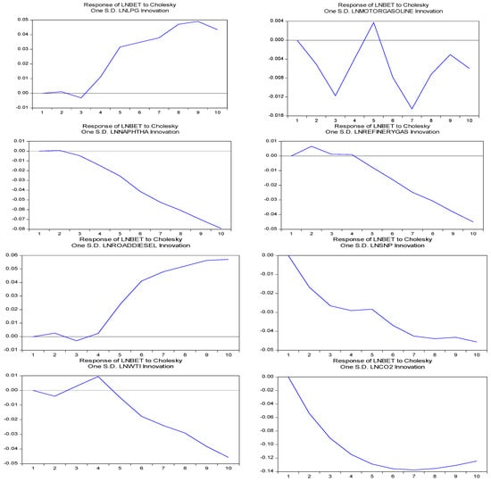 In the first period, the variance decomposition of BET is exclusively generated by its own innovations (for all variables). The contributions of LNGASDIESELOIL, LNLIGNITEBROWNCOAL, LNLPG, LNNAPHTHA, LNREFINERYGAS, LNROADDIESEL, LNSNP, LNWTI, and LNCO2 in explaining the LNBET forecast error variance increased during the 10th forecast period, but there are no significant changes in the contribution of LNBIODIESELS, LNKEROSENE, and LNMOTORGASOLINE.