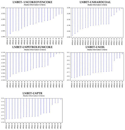 According to the results found in Table 5, the probability associated with the ADF test is below the 1%/5% relevance level for the variables of LNCOKEOVENCOKE, LNHARDCOAL, LNOIL, LNPETROLEUMCOKE, and LNPTR, so we can reject the null hypothesis and conclude that the series are stationary, and that the mean and variance of the series is constant over time.